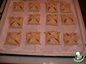 Смешиваем яичный желток с сахаром, мажем наши слойки и отправляем в духовку.