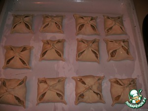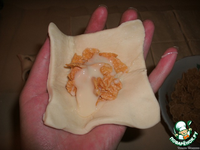 Готовое тесто режем на квадраты, примерно 10 на 10 см. Кукурузные хлопья и сгущеное молоко не смешиваем.