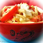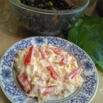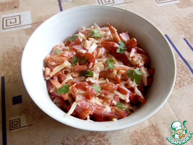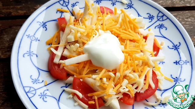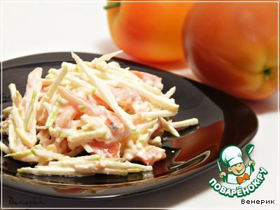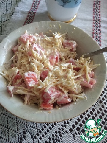 Этот салат я впервые попробовала в кафешке г. Туркменобат (Туркмения), с тех пор частенько его готовлю дома. Очень вкусное и пикантное сочетание зеленого яблока, помидора, сыра и чуточки чеснока.