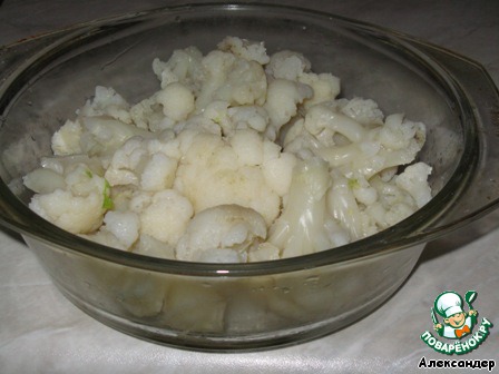 Отварить до готовности цветную капусту и выложить в форму для запекания, смазанную маслом.