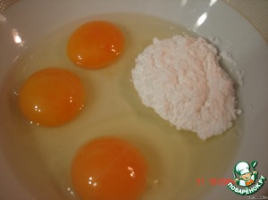 взбить 3 яйца с сах пудрой,постепенно добавляя муку-75гр