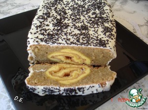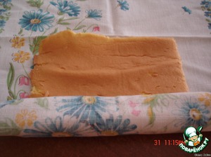 уложить на протвень покрытый бумагой половинку теста,сверху готовый рулет,сверху него 2-ю часть теста.Выпекать при 200 гр 40-45 минут.