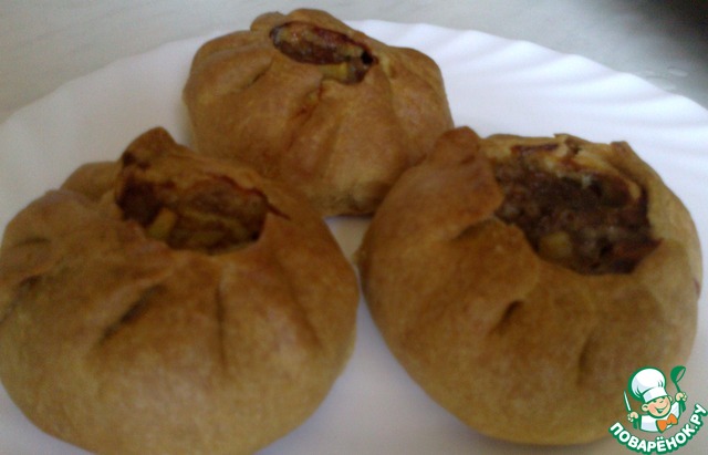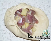 Разминаем ещё раз наше тесто, раскатываем маленькие лепёшечки размером с блюдце, кладём на середину фарш.