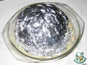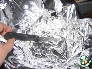 В посудину для запекания (у меня - стеклянная емкость для микроволновки) выкладываем фольгу крест-накрест. Прокалываем по периметру донышка ножом, чтобы вытекал сок.