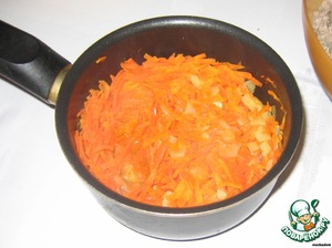 В кастрюльку с отложенным луком выкладываем морковь, слегка обжариваем (пару минут) и добавляем все тот же бульон (2-3 ложки). Накрываем крышкой и оставляем тушиться на маленьком огне.
