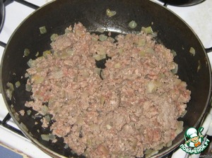К оставшейся части (огонь не гасим, но жарим на небольшом огне) выкладываем подсоленный и перченый (по вкусу) фарш. Любые эсперименты с вашими любимыми специями допускаются. :-) -