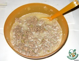 Яйца смешиваем с 1/2 стакана молока (можно просто разболтать вилкой) и выкладываем туда поджаренный фарш с луком. Все хорошенько перемешиваем. Жидкости будет многовато, так что не пугайтесь - все пойдет в дело. :-)