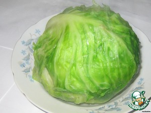 Кочан капусты моем, удаляем верхние листья и отвариваем целиком в горячей подсоленной воде. Варим до мягкости - у меня на средний кочан уходит примерно 30 минут.