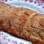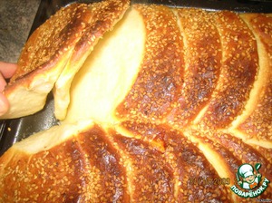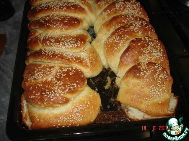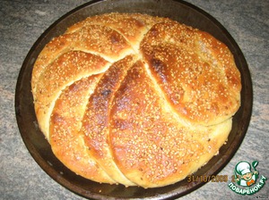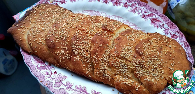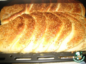 Смазать взбитым с солью яйцом и посыпать кунжутом (муж любит много кунжута).