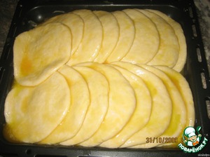 • Каждый кружок "потопить" в растопленном маргарине (тёплом) и выложить на противень (смазанный маргарином)