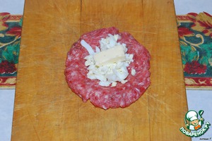 Из фарша делаем лепёшку и накладываем в центр кружка начинку (яйца)