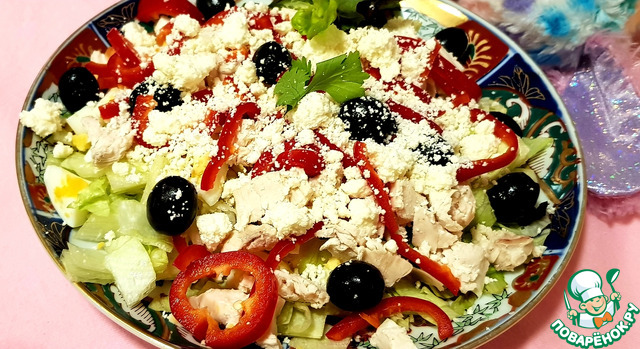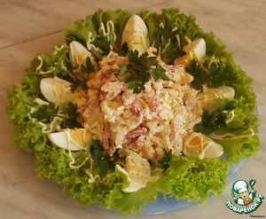 На блюдо разложить листья салата и четвертинки 2-х яиц. В середину блюда выложить салат.