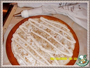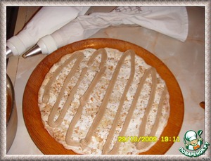 В моем случае 2 мешочка. Выдавливать крем на корж зигзагами, растягивая зигзаги с одного конца в другой.