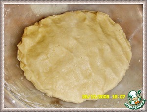 Взять одну часть теста, сделать шарик. Раскатать тесто на бумаге для выпечки (у автора дм 24), у меня дм 28. Выпекая один корж,сразу расскатывала другой,на другом формате.Раскатанное тесто по толщине будет тоненьким.