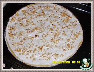 Намазать 2 полными с верхом ложки безе. Посыпать орехами. Поставить в духовку, разогретую до 180 градусов на 6 мин. (пока белок не поднимется). Затем убавить температуру до 120*С и выпекать еще 16 мин (высушить белок).