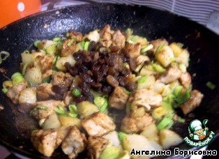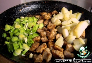 2. В двух ст.л подсолнечного масла, обжарить мясо, нарезанное кубиками, до золотистого цвета. Добавить нарезанную картошку и лук порей.