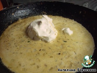 6. Влить бульон и сливки. Перемешать. Дать закипеть. Убавить огонь, и добавить сыр маскарпоне. Добавить специи по вкусу. Всё перемешать и снять с огня.