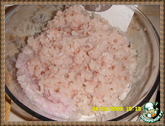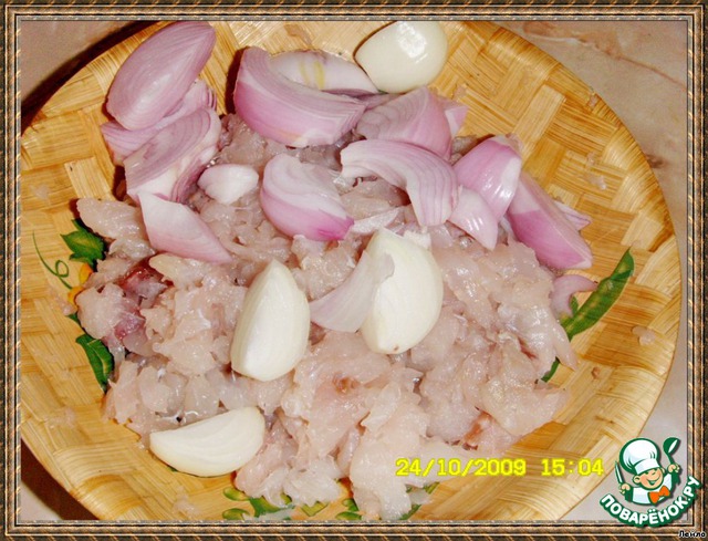 • Вначале пропустить через мясорубку лук, отжать слегка с него сок (чтобы в рыбе потом не чувствовалась горечь), перемолоть затем рыбу.