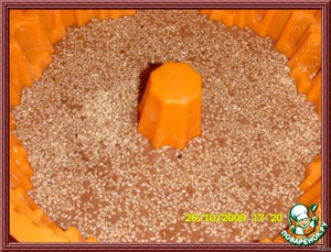 Вылить тесто в форму, посыпать сверху кунжутом.
