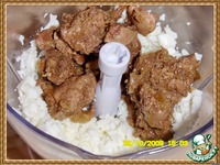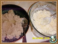 И каждую (по 2 ст. л) прибавить в печеночную и сырную массу соответственно, (при интенсивном размешивании). |