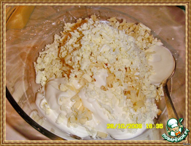 [b]Сырная масса [/b] 100 г сыра потереть на крупной терке, 4 вареных желтка, 3 ст. ложки майонеза. |