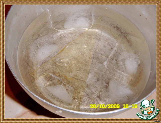 2 ст. ложки быстрорастворимого желатина развести в 4 ст. ложках воды. Замочила в ледяной воде. |