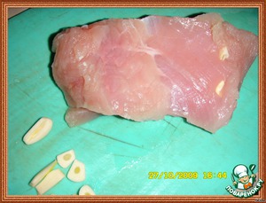 Через 2 часа вынимаем мясо, вытираем, нашпиговываем мясо чесноком.