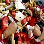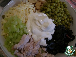 Грудку,перец и маслины порезать,чеснок пропустить через пресс,сыр потереть на тёрке.С грибов слить воду,добавить горошек и всё заправить майонезом.Чеснок можно не добавлять,но он добавляет свою пикантную нотку.