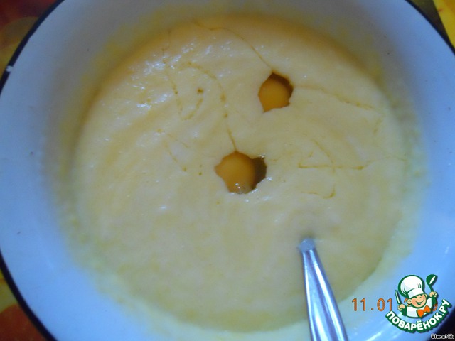 Добавить муку и тщательно перемешать. Получится вязкое тесто.
