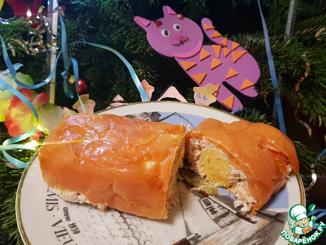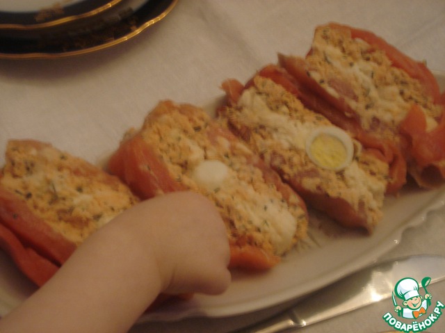 Уложить очищенные яйца посерединке, поверх лососевой массы.