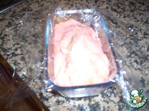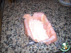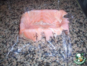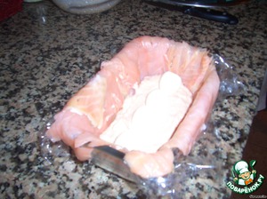 Закрыть кусочками лосося (свисающими), затем пленкой и поставить в холод часа на два.