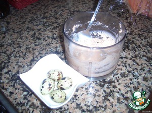 Отварить перепелиные яйца и параллельно перемолоть крабовые палочки в блендере до однородной массы и добавить вторую половину сливок. Тщательно перемешать.
