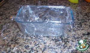 Взять форму (я брала прямоугольную) и выстлать ее пищевой пленкой, чтобы свисала. -