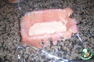 Затем выстлать внутреннюю часть формы кусочками соленого или копченого лосося (так, чтобы часть свисала).
