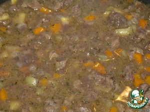 После этого добавим немного воды (если у вас есть гранатовый соус, то можете добавить к мясу в данный момент) и оставим тушиться на медленном огне примерно 1-1,5 часа, не забывая помешивать. По необходимости добавим чуть-чуть воды.