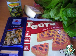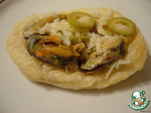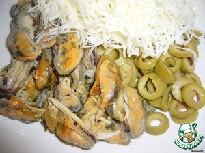 Приготовить начинку: нарезать оливки тонкими кольцами, сыр натереть на мелкой терке, добавить мидии (без масла), все перемешать.