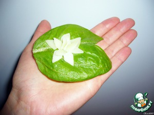 Вырезанным листом накрыть тарталетку, сверху выложить цветок в виде кувшинки из сыра.