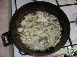 Порезать лук полукольцами, чеснок, и поджарить в масле...