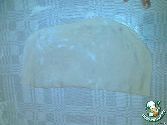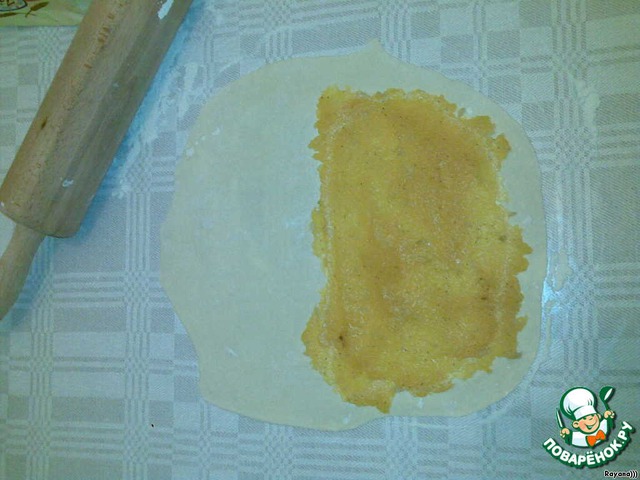 • выдавливаем из теста шарики, раскатываем в тонкий пласт, половину смазать начинкой,