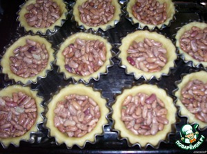 • Раскатать тесто, вырезать круги. Круги из теста уложить в смазанные маслом формочки. Насыпать фасоль в формочки, чтобы тарталетки не потеряли форму при выпечке.