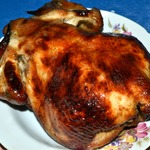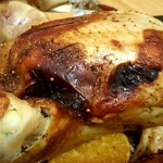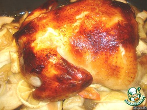 Укладываем курочку на лимончики, выливаем сверху маринад, а оставшийся лимон отправляем внутрь курицы. Ставим в холодную духовку. Включаем ее на 180 градусов. Запекаем полтора часа. Пару раз поливаем курочку образовавшимся соком.