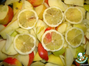 Яблоки хорошенько перемешиваем, выкладываем в противень, добавляем вино. Под курочку кладем тонкие кружки лимона.