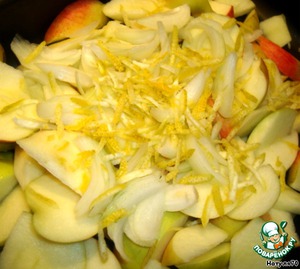 Яблоки нарезаем крупными дольками. Добавляем к ним нарезанный репчатый лук, цедру лимона. Немного солим.