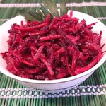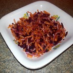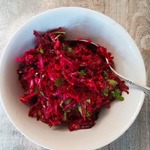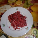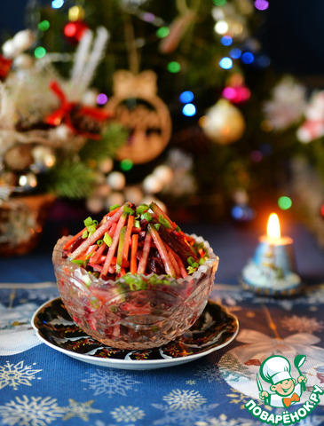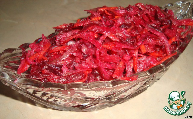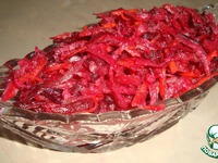 Я делала с сырой свеклой, чеснок добавлять не стала, т.к. салат готовила "с собой на работу", зато добавила чуть-чуть соевого соуса.