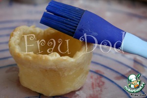 Готовые тарталетки извлечь из формы, смазать яйцом.