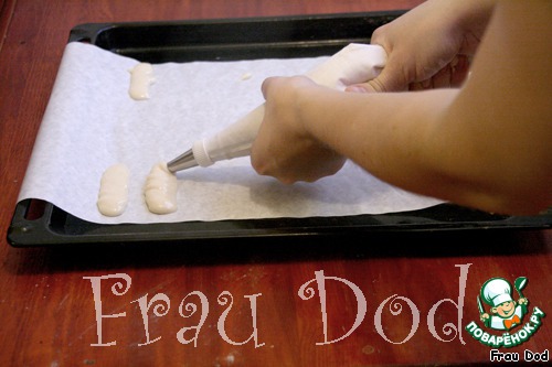 Бисквитное тесто выложить в кондитерский мешок, выдавить на противень, выложенный пергаментом и смазанный сливочным маслом (!). Сначала я выдавила массу просто на пергамент - получилось печенье для тех, кто любит пожевать бумажку :-D . Естественно, все прилипло. В следующий раз я выдавила ее на противень, смазанный растительным маслом и присыпанный мукой - все растеклось и получилась одна большая печенька размером с противень :-D В третий раз удалось укротить непокорный бисквит и все получилось!