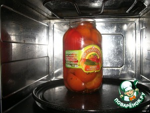 Готовим рассол по вкусу (я на литр беру столовую ложку соли и 2 сахара + приправа для маринада - там семена горчицы, кориандр, лавровый лист, стебли укропа). Уксус кладу на вкус, пробую. Крышки от банок - в рассол. Через 10 мин. можно приступать. Заливаю банку по плечики рассолом и сразу ставлю на максимальный режим в микроволновку. Как закипит, достаю, докладываю пару долек чеснока (если раньше, чеснок синеет), если помидоры просели, докладываю еще половинку, доливаю рассола и закатываю.