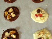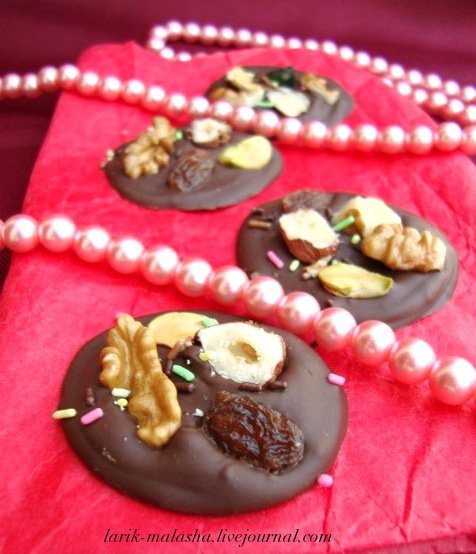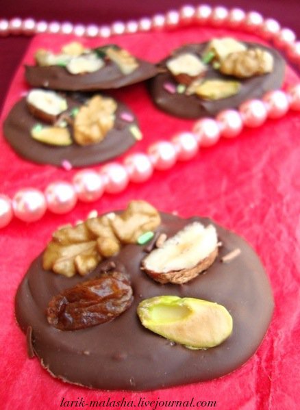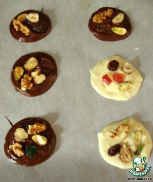 Сразу же выложить наполнители - орехи, изюм, цукаты. Поставить в прохладное место, чтобы шоколад застыл. Аккуратно снять с противня и подавать. |