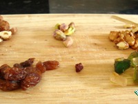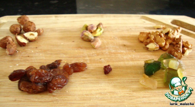 Очистить орехи, помыть и обсушить изюм, нарезать на небольшие кусочки цукаты. |
