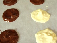 Противень застелить бумагой для выпечки и чайной ложкой выложить кружки из шоколада, разровнять. |